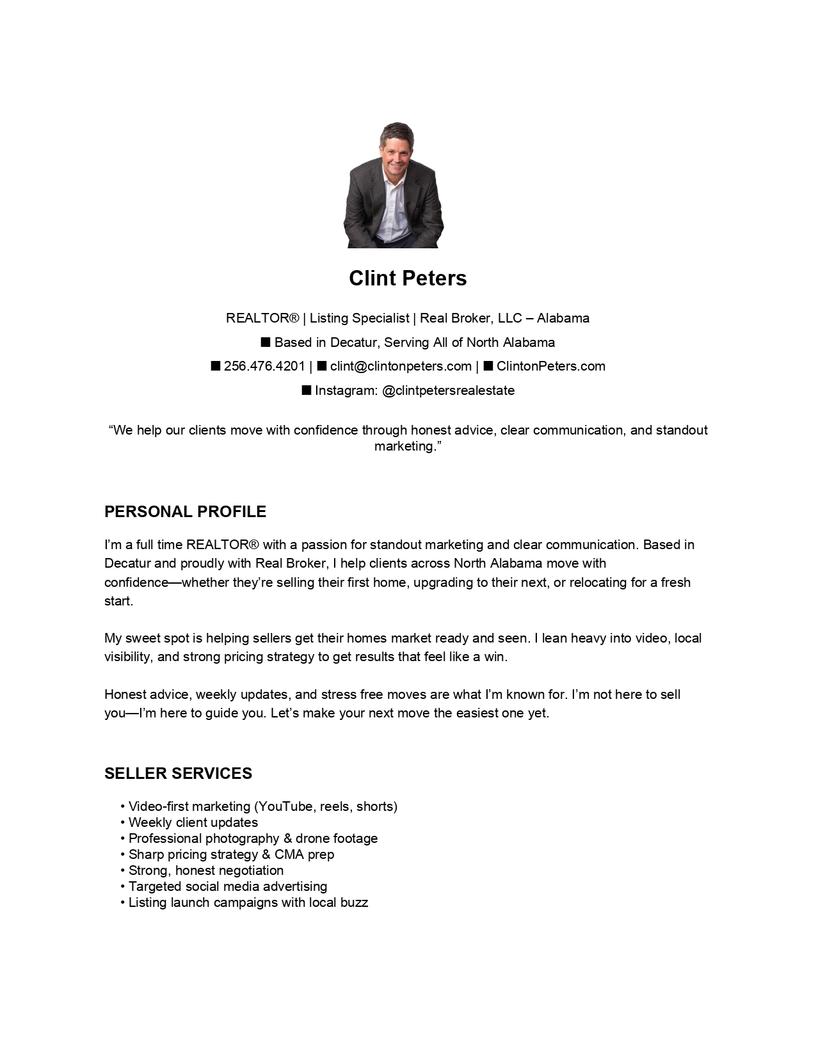 Clint Peters is a top-producing REALTOR® with Real Broker, proudly serving Decatur, Hartselle, Athens, Madison, Huntsville, and surrounding North Alabama communities. A Decatur native with deep local roots, Clint graduated from Decatur High School and the University of Alabama before returning home to raise his family. Over the past 8 years, he’s helped more than 100 families buy and sell homes, earning him a spot in the top 10% of agents in the region.